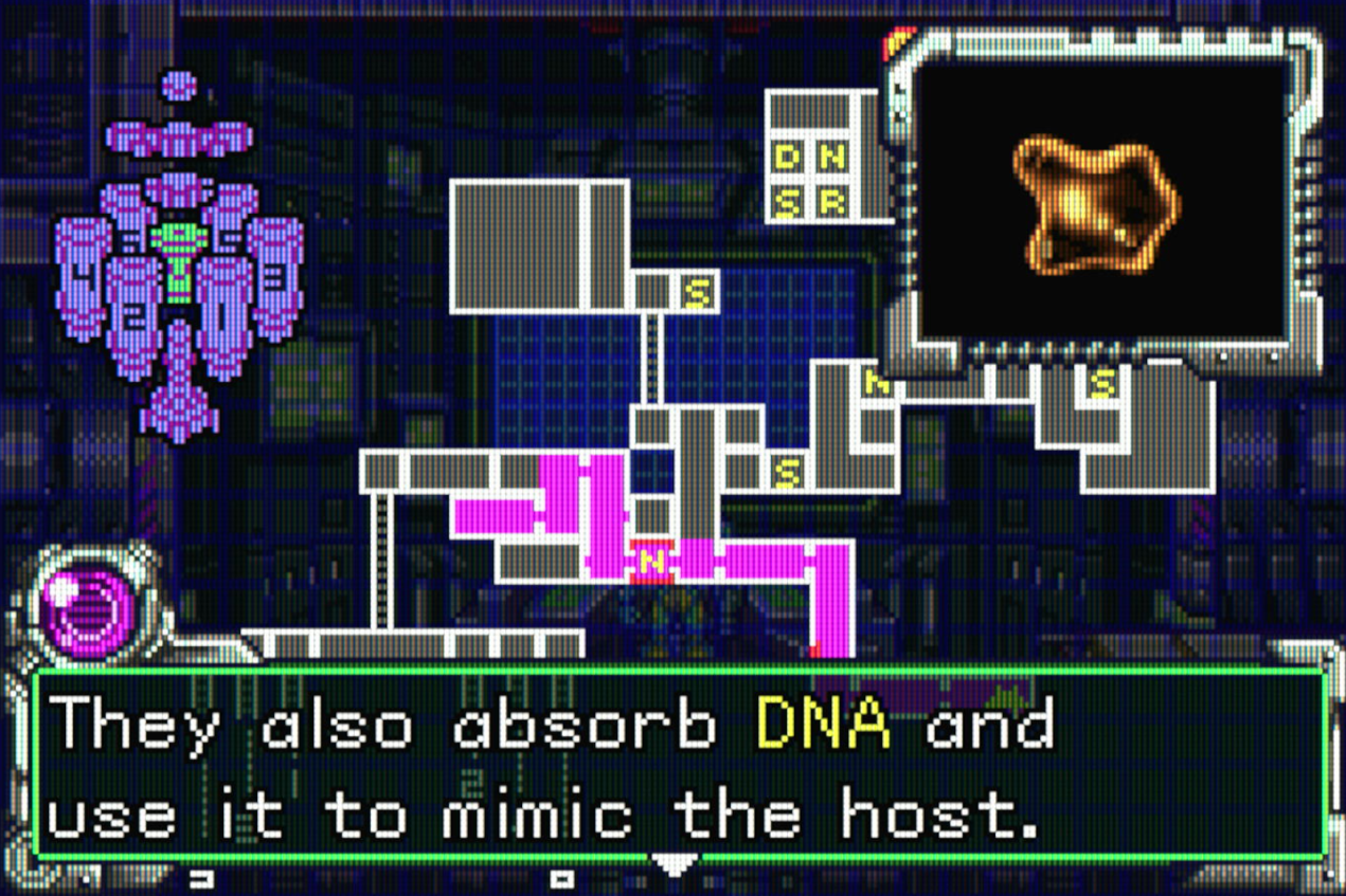Metroid Fusion, on the other hand, definitely feels like it's taking more than a few notes from another sci-fi thriller movie, by almost essentially making you fight 1982's The Thing over the course of a whole game. Just made more suited for the far-flung futuristic setting of Metroid than Thing's more down-to-earth setting. Immediately off the bat, you're introduced to the X Parasites, gelatinous amoeba creatures that can infect any living organism and copy its exact genetic makeup, becoming a mutated, sometimes even cross-bred version of any creatures that individual X has come in contact with.