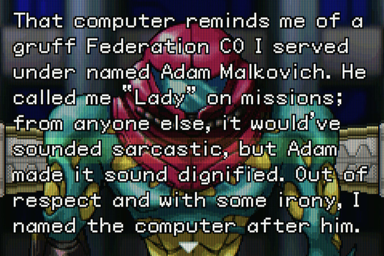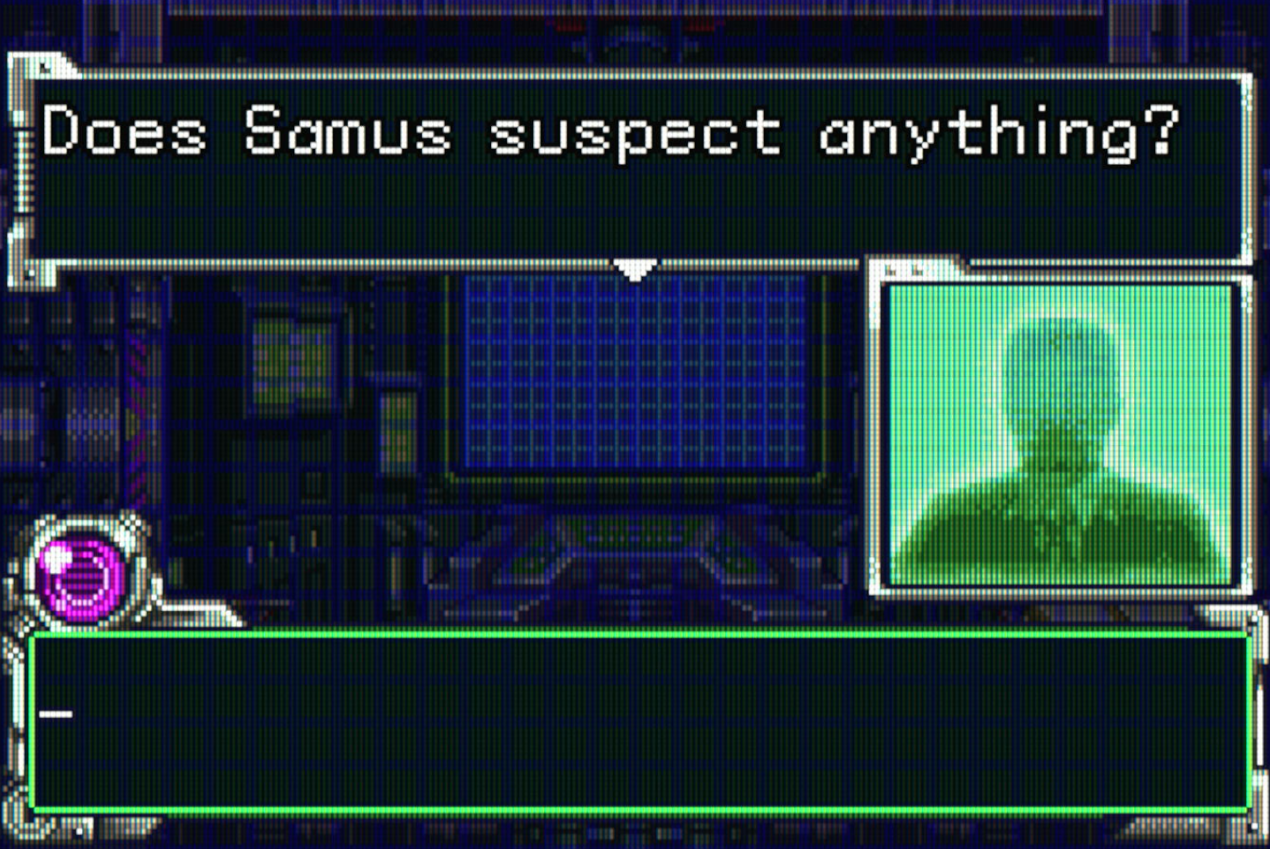 ...This, feeling a bit patronizing when it plays a cutscene outside of Samus' perspective just to have a shady figure ask Adam if Samus "suspects anything", which feels like about as comically blunt as foreshadowing gets.