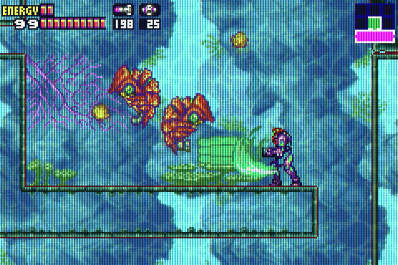 Sure, this done in large part because Samus is far more nimble in this game, having some additions to her basic movement set, having far less floaty jumps, a new ledge-grab, and much snappier controls. Instead of assigning a diagonal to a shoulder button, they're now on just the L button, you just point up or down on the D-Pad to point at which diagonal direction you want to aim. This also frees up the GBA's scant few buttons so that missiles are active when you hold the R shoulder button instead of juggling Super's far more cumbersome selection menu. All moves that definitely give Samus a notable amount more finesse.