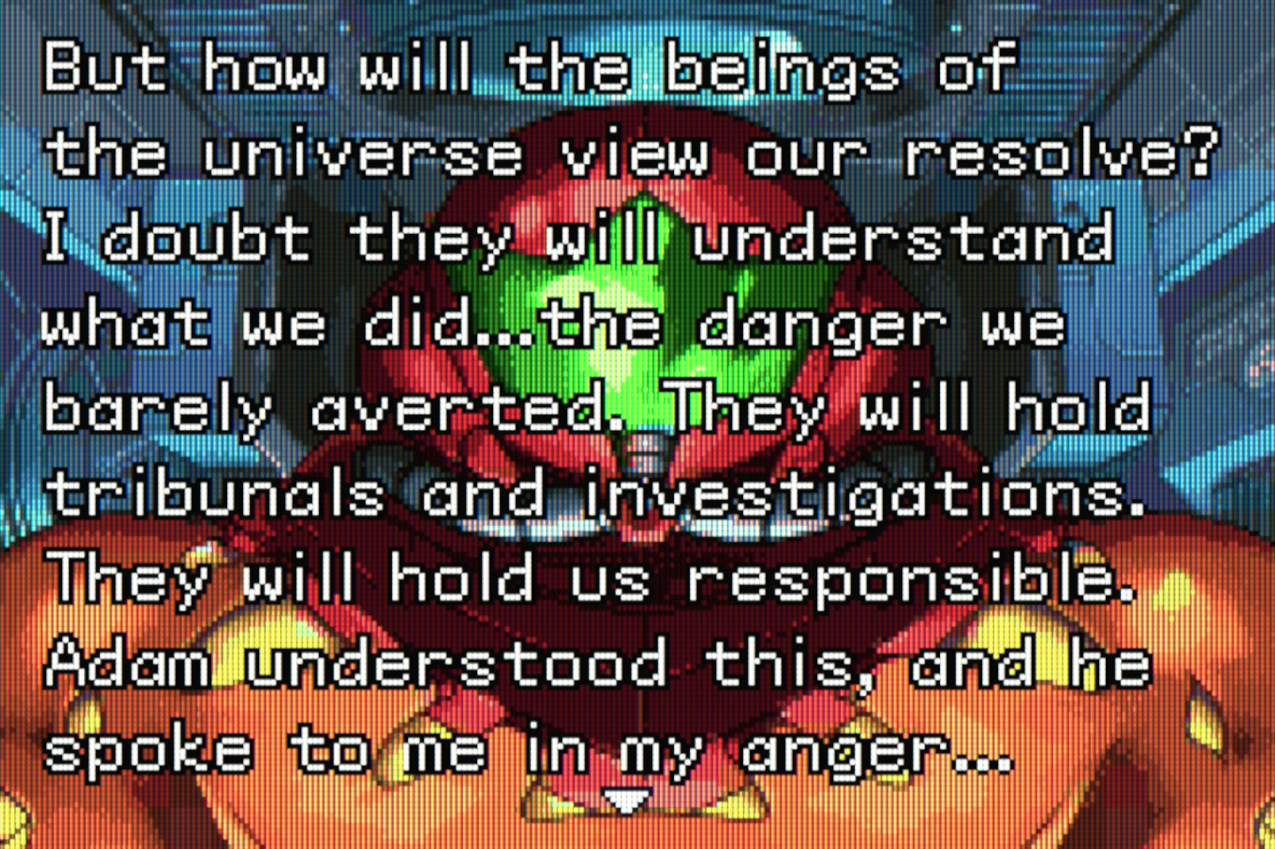And in a last, ending monolog, Samus laments about her fate and how the Federation would take her taking matters into her own hands and eradicating all X life. Which only makes it stink more when it turns out, all this being the Federation's doing was a mistranslation by omission, as in the original Japanese script, it was explicitly a rogue faction of the Federation doing these sketchy things on the BSL. Which, I can't be alone in feeling like this defangs this story by a lot, right? It's still easily the best Metroid story so far in this series, but the English version of it that frames the Federation themselves as a hypocritical government that's willing to employ the very types of technology they deemed illegal just seems far FAR more interesting than the original Japanese version of these events. But I digress, I guess.
