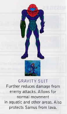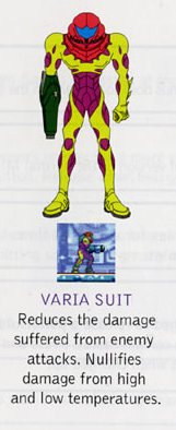 Same as it usually does. But with a twist! Since Samus is part Metroid now, she's a lot more weak to the cold. I mean, most people are, but I guess even her suit's basic insulation can't protect her, or something. As such Varia Suit now has the added functionality of making you able to enter super-cold areas as well as super-hot. The only trade-off is it's now a fugly green for a later-coming reason.